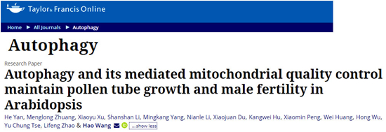 2022年7月4日,华南农业大学生命科学学院王浩教授团队在《Autophagy》 (2022 IF:13.391) 上发表题为“Autophagy and its mediated mitochondrial quality control maintain pollen tube growth and male fertility in Arabidopsis ”的研究论文,该研究揭示了在拟南芥花粉管生长和雄性生殖过程中,自噬在介导线粒体质量控制中发挥重要的调控生物学功能。