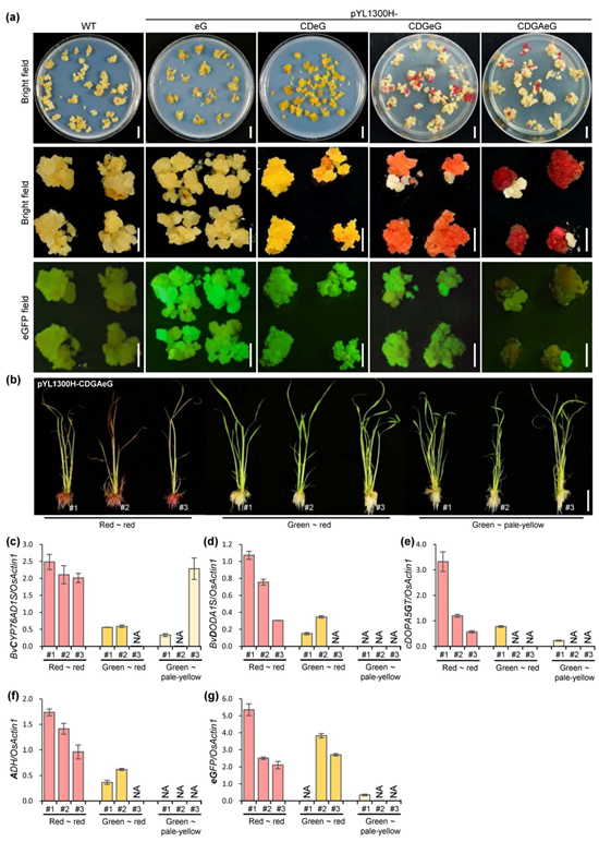 图2 甜菜红素在转基因水稻中的合成。(a)四个多基因载体(pYL1300H-eG, pYL1300H-CDeG, pYL1300H-CDGeG and pYL1300H-CDGAeG)获得的转基因水稻愈伤表型;(b)pYL1300H-CDGAeG获得转基因水稻植株表型:Red ~ red表示从红色愈伤组织分化获得的红色转化植株;Green ~ red表示从红色愈伤组织分化获得的绿色转化植株(无甜菜红素合成);Green ~ pale-yellow表示从淡黄色愈伤组织分化获得的绿色植株(无甜菜红素合成);(c-g)转基因水稻植株外源基因的qRT-PCR分析