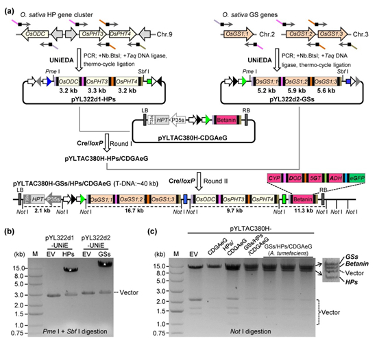 图3 TGSII-UNiE系统对多基因的高效组装。(a)利用UNiEDA方法分别在多基因供给载体上一步组装HP基因簇的3个基因(OsODC, OsPHT3 和OsPHT4)与谷氨酰胺合成酶的3个基因(OsGS1;1, OsGS1;2 和 OsGS1;3),再通过两轮简单的Cre/loxP重组,组装上述多个基因到含5个基因的双元接受载体,获得含12个基因的多基因双元载体pYLTAC380H-GSs/HPs/CDGAeG;(b)多基因供给载体的酶切检测;(c)多基因双元载体的酶切检测与在农杆菌中的稳定性检测