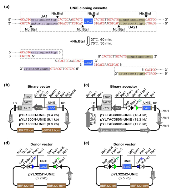 图1 TGSII载体系统.(a)UNiE克隆盒的序列特征;(b)含UNiE克隆盒的pCAMBIA骨架的双元载体;(c)含UNiE克隆盒的TAC骨架的双元接受载体;(d和e)含UNiE克隆盒的多基因供给载体