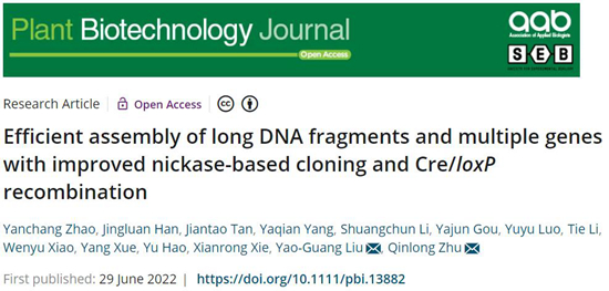 近日,我校生命科学学院、亚热带农业生物资源保护与利用国家重点实验室和岭南现代农业科学与技术广东省实验室刘耀光院士/祝钦泷研究员团队在国际知名学术期刊Plant Biotechnology Journal(IF2021=13.263,生物学/工程技术1区)在线发表了题为“Efficient assembly of long DNA fragments and multiple genes with improved nickase-based cloning and Cre/loxP recombination”的研究论文(论文链接:https://onlinelibrary.wiley.com/doi/10.1111/pbi.13882),利用特异核苷酸序列引导的缺刻酶介导的DNA组装与Cre/loxP重组相结合,开发了一种新的简单、高效、低成本的大片段DNA克隆与多基因叠加系统TGSII-UNiE。