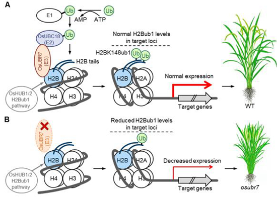 本研究通过一系列生化实验证明了OsUBR7作为一种新的E3连接酶催化水稻H2B单泛素化,是许多与细胞增殖和器官发育相关的基因位点的表观遗传调节因子。在野生型水稻中,OsUBR7特异性结合某些染色质区域的H2B并在K148处单泛素化修饰,此过程由OsUBC18充当OsUBR7的特异性E2泛素结合酶。通过改变这些基因位点的染色质状态,维持正常转录和细胞周期进程以确保正常发育。然而,在osubr7突变体植株中,OsUBR7的功能丧失导致靶基因位点的H2Bub1水平降低,从而降低靶基因的表达水平。受到抑制的细胞周期进程会导致节间变短,从而导致osubr7突变体的株高降低。OsUBR7所介导的这一新的植物H2Bub1修饰机制,不仅扩展了UBR7家族在真核生物中的已知功能也可以作为未开发的表观遗传资源,用来改善作物的株型和抗倒伏性状。
