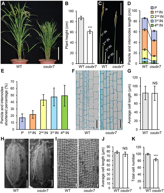 图1. 水稻半矮秆突变体osubr7表型鉴定