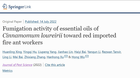 近日,华南农业大学亚热带农业生物资源保护与利用国家重点实验室吴鸿教授与徐汉虹教授课题组合作,在利用肉桂天然成分防治红火蚁研究中取得了重要进展,相关研究成果以“Fumigation activity of essential oils of Cinnamomum loureirii toward red imported fre ant workers”(论文链接:https://doi.org/10.1007/s10340-022-01540-1)为题目,在昆虫领域权威期刊《Journal of pest science》(中科院一区,IF 2021 = 5.742,昆虫学排名3/100)杂志上发表。生命科学学院2020级博士研究生邢欢铃和胡颍琦(2017级生命科学学院生物科学本科毕业生)为论文共同第一作者,吴鸿教授、徐汉虹教授为共同通讯作者。