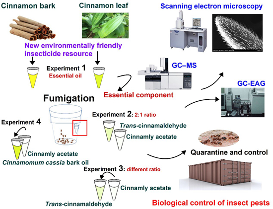 该研究采用在中国种植面积较大的品种越南肉桂为材料,分别对叶片精油和树皮精油,精油主要成分-反式肉桂醛、乙酸肉桂酯及其混合成分在不同时间、不同浓度的条件下,对红火蚁进行熏蒸活性研究,揭示出叶片精油杀虫效果强于树皮精油;叶片精油中含有较高成分的乙酸肉桂酯是导致叶片精油杀虫效果较强的主要原因;精油中反式肉桂醛与乙酸肉桂酯在2:1比例条件下可以高效作用于红火蚁。此外,通过触角电位和扫描电镜观察,发现精油及成分可能干扰红火蚁触角形态和识别受体进而导致其失去社会性,导致最终死亡。此研究为肉桂资源合理利用,特别是为利用肉桂叶精油研发新型环保性红火蚁杀虫剂提供了新思路和科学依据。该研究工作得到了广东省自然科学基金、广东省基础与应用基础研究基金、广东省林业科技创新基金项目、2019年华南农业大学高水平大学建设“冲一流”专项资金等的资助。(文图/生命科学学院 邢欢铃)
