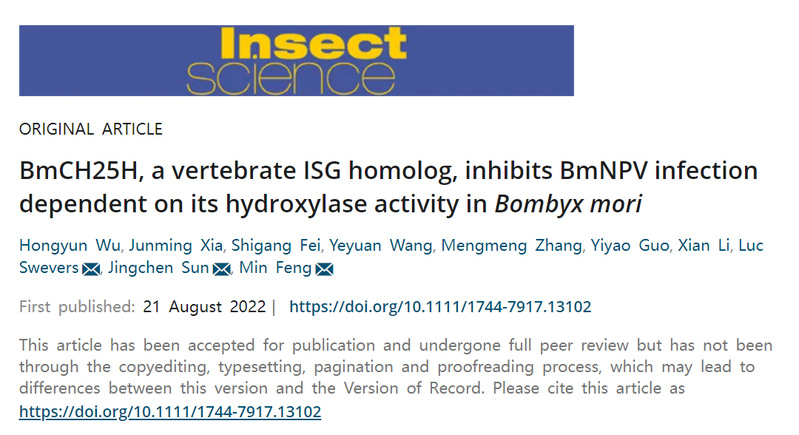 近日,我校动物科学学院2019级蚕学专业本科生吴鸿韵和张萌萌分别以第一作者身份相继在中国科技期刊卓越行动计划领军期刊Insect Science(影响因子3.605,中科院1区)和免疫学Top期刊Frontiers in Immunology(影响因子8.786,中科院2区)杂志发表研究论文。