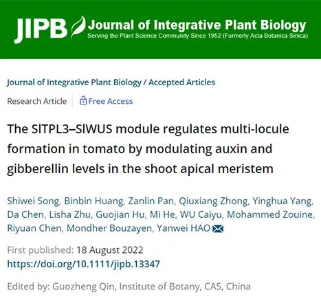 近日,我校园艺学院陈日远团队在国际知名学术期刊Journal of Integrative Plant Biology上发表了题为“The SlTPL3–SlWUS Module Regulates Multi-locule Formation in Tomato by Modulating Auxin and Gibberellin Levels in the Shoot Apical Meristem”(全文链接:https://doi.org/10.1111/jipb.13347)的研究论文。