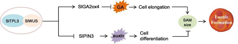 该研究发现番茄中的TOPLESS转录共抑制子SlTPL3是一个调控茎尖大小的基因,SlTPL3基因的沉默导致茎尖分生组织变大,果实心室数量增加,果实变大。外源IAA以及GA合成抑制剂PAC处理恢复了SlTPL3RNAi植株多心室的表型。SlTPL3定位于细胞核并与转录因子SlWUS互作,SlTPL3和SlWUS蛋白的相互作用增强了SlWUS对下游靶基因SlPIN3、SlGA2ox1的抑制和激活作用。因此,SlTPL3-SlWUS模块通过调控SlPIN3和SlGA2ox1介导IAA分布和GA水平来维持SAM的大小。该结果揭示了SlTPL3-SlWUS作为维持SAM大小的关键调控因子在多心室形成的过程中发挥重要功能,为多心室形成的机制提供了新见解,具有重要意义。