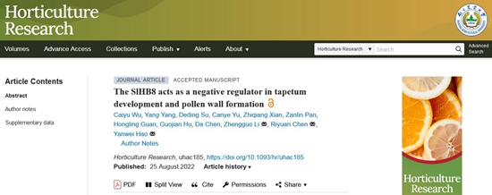 近日,我校陈日远团队联合重庆大学李正国团队在国际知名学术期刊Horticulture Research上发表了题为“The SlHB8 acts as a negative regulator in tapetum development and pollen wall formation in tomato”(全文链接:https://academic.oup.com/hr/advance-article/doi/10.1093/hr/uhac185/6675605)的研究论文。