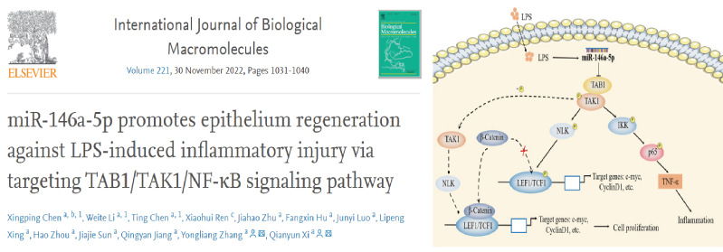 此外,动物microRNA也是调节肠道炎症的重要分子。肠道健康是保障仔猪健康、提高仔猪存活率的关键。肠道屏障是机体防御外来抗原的重要防线。断奶应激会增加肠粘膜的通透性、破坏肠道屏障结构和功能的完整性,影响仔猪的肠道健康。仔猪肠道屏障功能障碍是导致仔猪腹泻、生长缓慢和存活率降低的主要因素,也是目前我国生猪养殖中存在的主要问题。2022年9月7日接收在International Journal of Biological Macromolecules期刊上发表的题为“miR-146a-5p promotes epithelium regeneration against LPS-induced inflammatory injury via targeting TAB1/TAK1/NF-κB signaling pathway”的论文(原文链接:https://authors.elsevier.com/c/1fljS_3ENNUkvw)。论文通讯作者为张永亮教授和习欠云教授,第一作者为华南农业大学动物科学学院陈星平博士、李威特硕士和陈婷副教授。该研究探究了miR-146a-5p在肠道上皮细胞介导的免疫应答中的作用和机制。该研究发现LPS刺激极显著上调了肠道miR-146a-5p的表达,而miR-146a-5p缺失会加剧肠道屏障的损伤并抑制其上皮重塑。此外,该研究还首次发现miR-146a-5p通过靶向TAB1抑制NF-κB通路的激活,从而减轻肠道炎症反应。因此,miR-146a-5p可能被认为是一种有前景的炎症性疾病生物标志物,为缓解仔猪断奶应激提供了一种有效的治疗方法,并为改善动物肠道健康提供了实验基础。