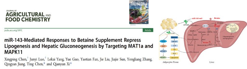 肝脏是物质代谢的中心,动物microRNA是调节机体基因信息传递和信号传递的重要分子。糖脂作为重要的营养素,是饲料中重要的能源物质,糖脂的利用直接关系到饲料的转化效率,畜产品的品质和动物的生长,以动物microRNA为研究对象,研究肝脏对糖脂代谢具有重要的意义。2022年6月23日在Journal of Agricultural and Food Chemistry期刊上发表的题为“miR-143-Mediated Responses to Betaine Supplement Repress Lipogenesis and Hepatic Gluconeogenesis by Targeting MAT1a and MAPK11”的论文(原文链接:https://pubs.acs.org/doi/full/10.1021/acs.jafc.2c02940)。该论文通讯作者为陈婷副教授和习欠云教授,第一作者为华南农业大学动物科学学院陈星平博士和博士生罗君谊,该研究探究了miR-143对甲基供体利用与互作的调控机制以及对肝脏嘌呤、糖脂代谢的影响机制。该研究首次发现miR-143通过GPNMB调节机体的脂肪合成;通过靶向MAPK11调节肝脏糖异生;通过靶向MAT1a调节蛋氨酸循环,参与甲基代谢。此外,甜菜碱与miR-143对蛋氨酸循环存在正-负调节,进而影响糖脂代谢。研究成果从miRNA与甲基供体间的响应机制上为揭示肝脏物质代谢的调节机制提供新的理论基础。