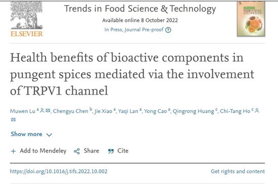 近日,我校食品学院、广东省功能食品活性物重点实验室、广东省珠江人才计划引进创新创业团队项目子课题负责人吕慕雯副教授以第一作者和通讯作者身份就香辛料活性物的健康效应机制在Trends in Food Science & Technology(影响因子16.002)发表了重要研究性论文“Health benefits of bioactive components in pungent spices mediated via the involvement of TRPV1 channel ”(https://doi.org/10.1016/j.tifs.2022.10.002)。