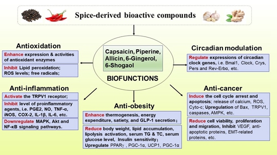 本课题组前期研究发现,香料中的生物活性成分辣椒素和胡椒碱可以在调节体温、代谢稳态、氧化应激、炎症反应和肿瘤发生过程中直接对肝脏核心时钟基因的表达也具有一定调控作用。通过对生物钟反馈环路的过程研究,充分发掘香辛料活性物预防和治疗代谢紊乱、氧化还原失衡、肠道菌群紊乱、炎症和癌症作用的分子机制。