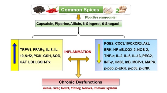 香辛料生物活性成分可以通过抑制促炎介质(如PGE2、NO、TNF-α、iNOS、COX-2、IL-1β)的表达以及下调p38 MAPK和NF-κB信号通路来抑制炎症损伤。香辛料活性物能够通过与多个靶点相互作用,影响改变的炎症反应途径以及与慢性疾病相关的介质,可以作为新型安全的抗慢性功能障碍的靶向物质。