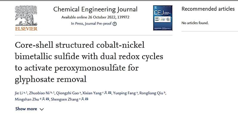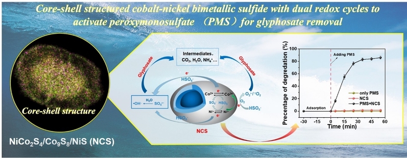 近日,我校材料与能源学院绿色能源材料科研团队张声森副研究员、方岳平教授在国际化工领域的权威期刊Chemical Engineering Journal(工程技术一区top期刊,影响因子16.744)发表题为《Core-shell structured cobalt-nickel bimetallic sulfide with dual redox cycles to activate peroxymonosulfate for glyphosate removal》的科研论文(https://www.sciencedirect.com/science/article/pii/S1385894722054523)。论文第一单位为华南农业大学,我校2020级硕士研究生李洁为论文第一作者,资源环境学院倪卓彪博士为并列第一作者,我校材料与能源学院张声森副研究员为主要通讯作者,生物质工程研究院杨希贤副研究员和暨南大学朱明山教授为共同通讯作者。