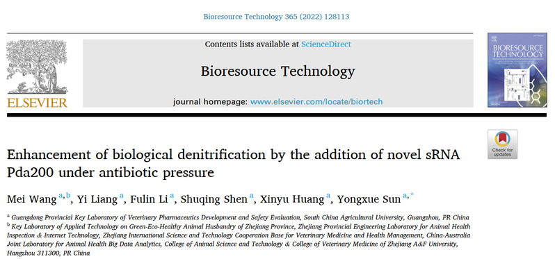 近日,我校兽医学院孙永学教授团队在养殖源抗生素污染的修复技术方面取得进展,最新成果“Enhancement of biological denitrification by the addition of novel sRNA Pda200 under antibiotic pressure”(https://doi.org/10.1016/j.biortech.2022.128113)在国际知名期刊Bioresource Technology上发表(一区,影响因子11.889),这是继在Environmental Pollution(二区,影响因子9.988)、Ecotoxicology and Environmental Safety(二区,影响因子7.129)等期刊发表论文后的第3篇阶段性成果研究论文。