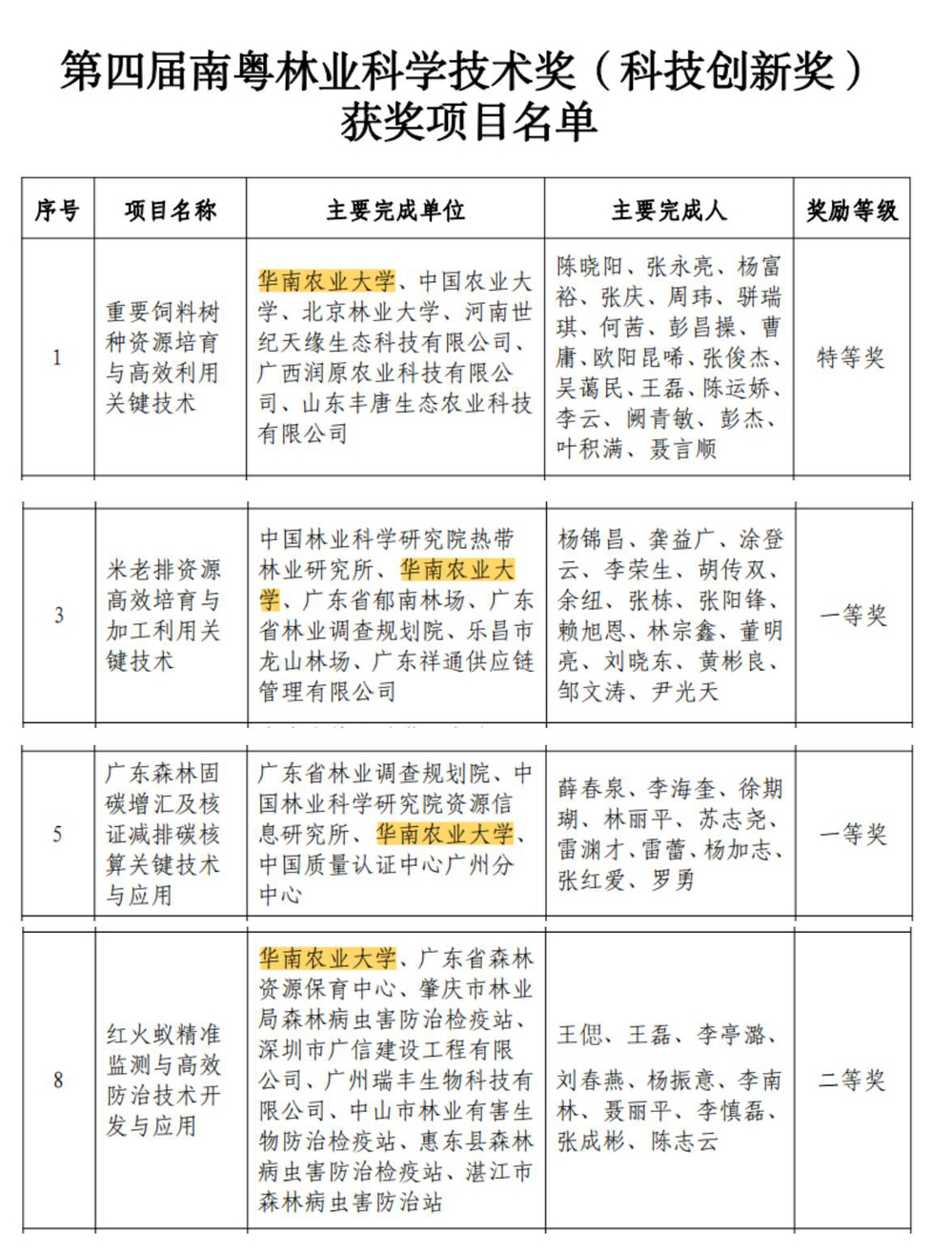 近日,广东省林学会发布了《关于第四届南粤林业科学技术奖评选结果的通报》,由我校林学与风景园林学院陈晓阳教授团队主持申报的科研成果“重要饲料树种资源培育与高效利用关键技术”获得第四届南粤林业科学技术奖(科技创新奖)特等奖,王偲教授主持的“红火蚁精准监测与高效防治技术开发与应用”项目获得二等奖。此外,我校林学与风景园林学院苏志尧教授参与的项目“广东森林固碳增汇及核证减排碳核算关键技术与应用”、材料与能源学院胡传双教授参与的项目“米老排资源高效培育与加工利用关键技术”分别获得一等奖。