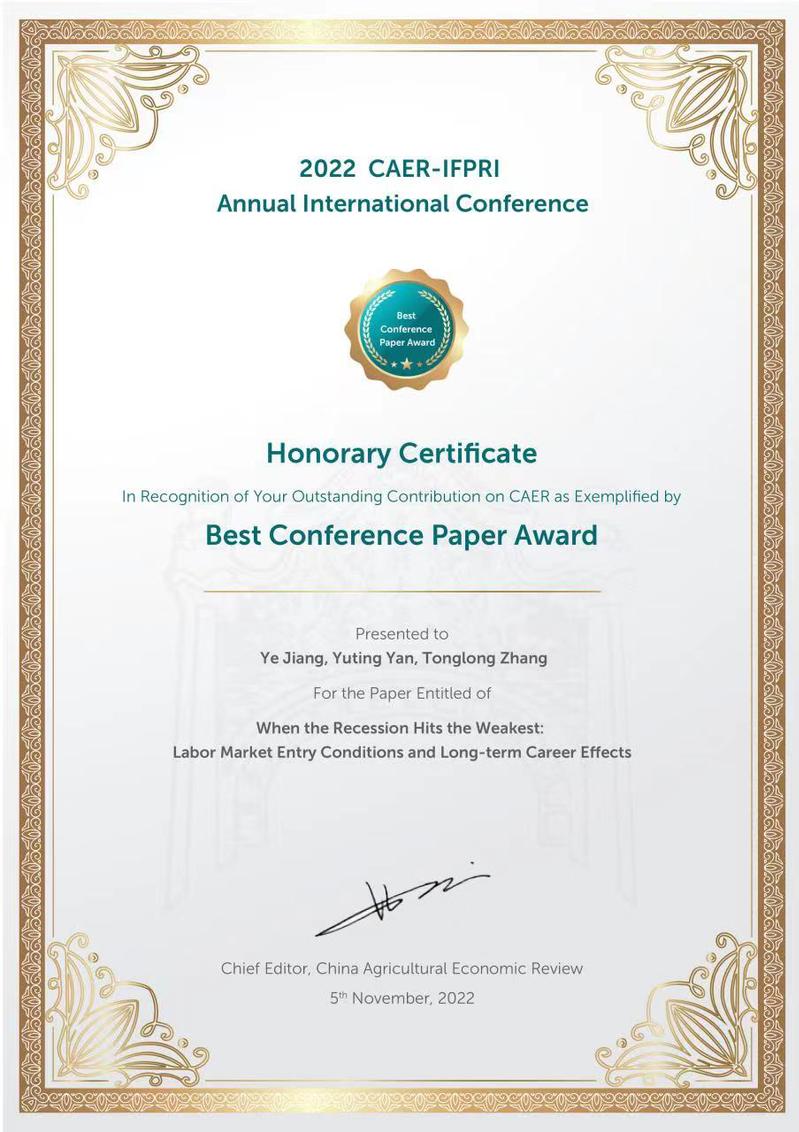 在日前召开的第十四届CAER-IFPRI国际学术研讨会上,我校国家农业制度与发展研究院(NSAID)团队研究论文《经济衰退下的最弱者:初入就业市场的经济形势和长期职业影响》(When the Recession Hits the Weakest: Labor Market Entry Conditions and Long-term Career Effects)获得最佳会议论文奖(Best Conference Paper Award)。论文第一作者为蒋烨博士,通讯作者为张同龙教授。