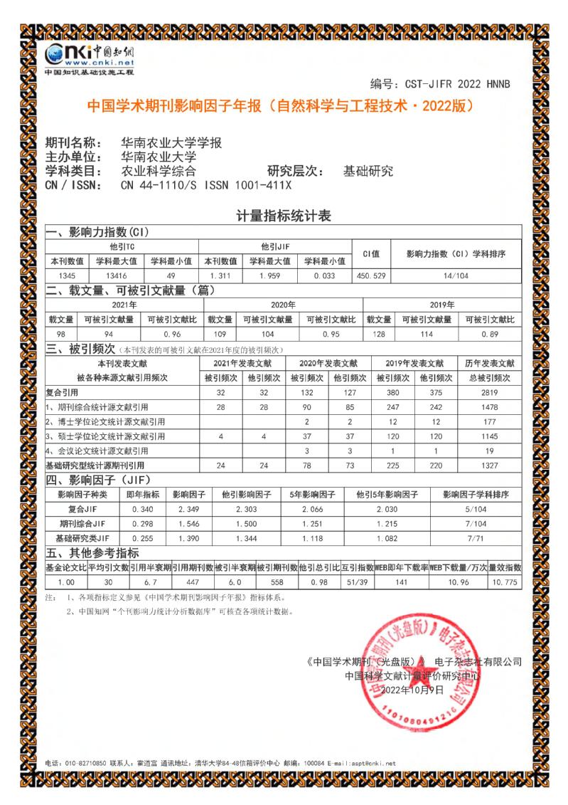 近期,中国知网与中国科学文献计量评价研究中心公布了《中国学术期刊影响因子年报(自然科学与工程·2022版)》,《华南农业大学学报》(以下简称《学报》)的复合影响因子(JIF)再创新高,达到2.349,相比2021版的2.000和2020版的1.549,《学报》复合JIF稳步提升,在“农业科学综合”类104种期刊中排第5位,继续领跑Q1区。