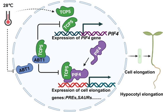 WRKY14的氨基酸序列与ABT2/WRKY35ABT3/WRKY65ABT4/WRKY69的氨基酸序列高度相似并属于系统发育树中的同一进化支,这些WRKY的功能均未知。过量表达ABT2/WRKY35ABT3/WRKY65ABT4/WRKY69的转基因株系均表现出和abt1-D类似对高温不敏感的表型。通过构建多重突变体,发现abt1 abt2 abt3 abt4四重突变体表现出与abt1-D相反的表型,对高温更敏感,下胚轴更长;进一步通过酵母双杂交、荧光素酶互补和Co-IP等实验证明了ABT1可以与TCP5TCP13TCP17相互作用;通过一系列生化实验,研究者揭示了ABT1调控植物热形态建成的分子机制,即ABT1TCP5的相互作用,一方面抑制了TCP5PIF4转录的激活,另一方面通过与PIF4争抢TCP5抑制了PIF4-TCP5转录激活复合体的活性,从而精细调控PIF4的转录激活活性和植物对高温的反应。研究者还通过一系列的遗传互作实验证明了ABT1确实与热形态建成的正调控因子PIF4TCP5BZR1具有相反的作用