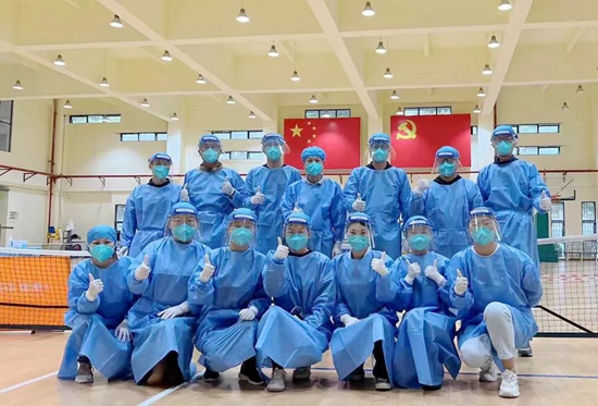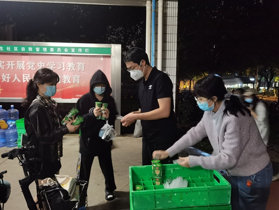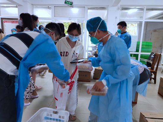 300多名教职工组成应急突击队、党员先锋突击队,闻令而动,逆向而行,奔赴抗疫一线,承担师生核酸检测、流行病学调查、校园管控、环境保护与消杀、封控楼餐食物资配送和后勤保障等方面工作,分工合作、行动到位。封控区内,前线作战的突击队员身穿防护服,将一份份盒饭送至每一个学生宿舍,送到每一个学生手中,并收走学生宿舍的生活垃圾。