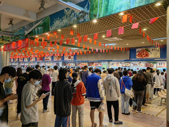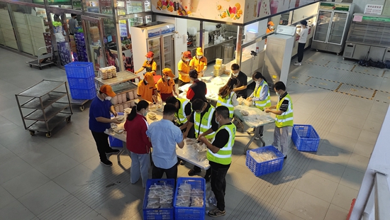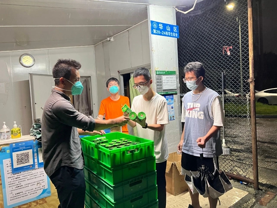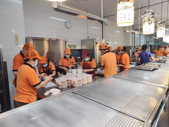 资产处、总务部、信网中心、资产公司等单位通力合作,全力保障疫情期间防疫物资、师生用餐、用水、用电、用网等方面物资储备和调配供给,为校园抗击疫情筑起坚强后盾。如,各大饭堂工作人员加班加点赶制餐食,保障供应,并为封控管理的楼栋提供免费餐食配送,仅11月23日当天,饮食服务中心就向学生供应早、午、晚餐共计9.8万份,学校总务部、资产公司还为全校每位同学提供免费饮用水、水果、酸奶等物资,送去关怀温暖。