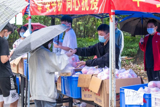 石同学表示,对于临时封控,自己起初并没有做好准备。但班主任老师及时开会抚慰了大家,她也就藏起了自己的不安。水果、酸奶和鸡腿的发放都是在基础生活需求以外的补给,石同学提及这些止不住笑意,“让我感觉到我们真的是被关心和爱护的!”
