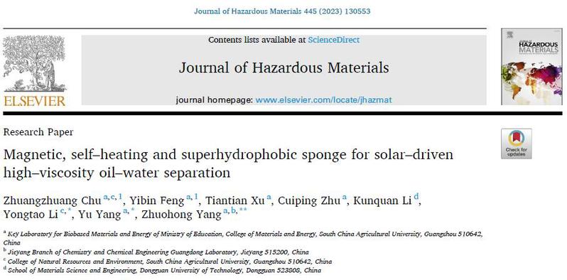 近日,我校材料与能源学院杨卓鸿教授研究团队联合资源环境学院李永涛教授团队在环境修复材料领域取得新进展,相关研究成果以“Magnetic, self–heating and superhydrophobic sponge for solar–driven high–viscosity oil–water separation”(论文链接:https://doi.org/10.1016/j.jhazmat.2022.130553)为题在环境科学与生态学领域知名期刊Journal of Hazardous Materials(中科院一区Top,影响因子 14.224)上发表。论文共同第一作者为我校博士后楚状状和2021级硕士研究生冯逸彬,通讯作者为杨卓鸿教授、杨宇副教授和李永涛教授,研究得到了广东省自然资源厅项目、广州市科技计划项目、博士后面上及特别(站中)资助等项目的支持。