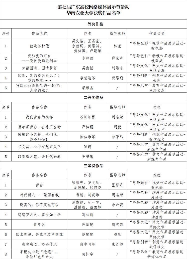 我校党委高度重视本次活动,党委宣传部、党委学生工作部(党委研究生工作部)积极动员并组织全校师生踊跃投稿,认真遴选了一批优秀作品进行申报。最终,《他是谷种佬》获“粤易光影”视觉作品展示活动一等奖,《我和我的家乡——脱贫漫画微剧本》获“粤易色彩”动漫作品展示活动一等奖,《梦留国清,国清梦留》获“粤易文化”网文作品展示活动一等奖,《这次,真的要说再见了!我的华农……》获“粤易创新”创意作品展示活动一等奖,《写给2022级新生的一封信:大学的意义》获“粤易乐学”教育作品展示活动一等奖。