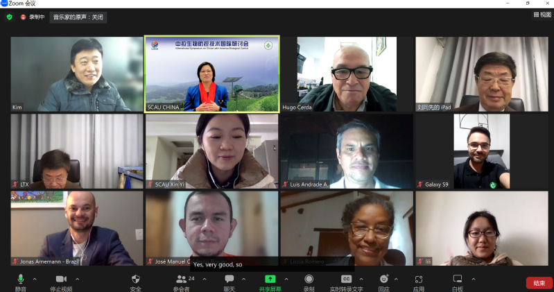 贵州大学刘同先教授和我校金丰良教授担任报告主持人。来自中国、巴西、阿根廷和委内瑞拉的10名专家学者作主旨报告。多个盟员高校和研究机构的近百位专家在线上分享了各国病虫害生物防治技术的研究进展。委内瑞拉西蒙罗格里格斯国立实验大学Hugo Cerda教授与贵州大学刘同先教授作总结发言。两位教授提出,中拉专家要继续加强合作,共同研发新型病虫害防控技术,为保障农业可持续发展和粮食安全做出更大贡献。