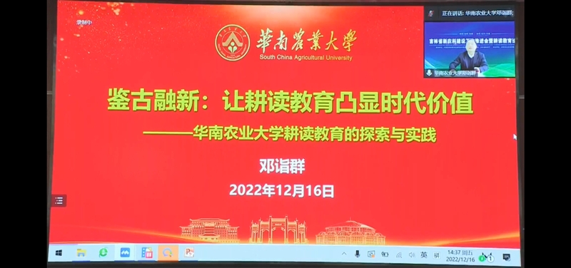 我校副校长邓诣群教授受邀在会议论坛上作题为“鉴古融新:让耕读教育凸显时代价值——华南农业大学耕读教育的探索与实践”的报告。报告分“鉴古融新:时代赋予耕读教育的新内涵”、“传承创新:华南农业大学耕读教育的探索与实践”、“深化耕读教育的几点思考”三个部分展开,全面、生动、详实地介绍了现代耕读教育理念和我校开展耕读教育的实践经验与举措,并对完善耕读教育体系、全面推进乡村振兴、加快实现农业农村现代化给予人才支撑提出了独到见解。报告最后发出三点倡议:一是深化耕读教育资源协同创新,建立优质资源全国共享机制;二是加强耕读教育理论研究和成果推广,建立耕读教育协作联盟组织;三是积极创造条件举办耕读教育成果比赛,推动新时代耕读教育人才培养。