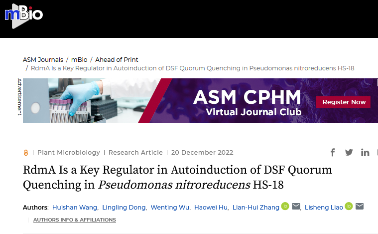近日,我校群体微生物研究中心张炼辉教授团队在微生物权威期刊mBio(影响因子7.786,中科院1区Top期刊)上发表了题为“RdmA Is a Key Regulator in Autoinduction of DSF Quorum Quenching in Pseudomonas nitroreducens HS-18”的研究论文(链接:https://journals.asm.org/doi/10.1128/mbio.03010-22),报道了一个关键的调控因子RdmA及其调控的代谢基因簇dmgA-H在DSF群体淬灭过程中的重要作用。