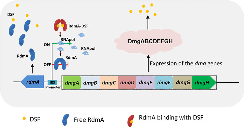 研究团队前期发现Pseudomonas nitroreducens HS-18的DSF淬灭基因表达受DSF的诱导调控(Wang et al., 2020,AEM 86:e02930-19),为阐明其调控机制,研究团队通过RNA-seq比较分析,筛选出了20个转录水平显著受DSF信号分子影响的调控因子,并利用报告系统HS-18(digA::lacZ),筛选出了对DSF淬灭基因digA具有相对最显著调控作用的调控因子RdmA。通过蛋白结构域分析发现,RdmA属于同时具有配体结合结构域和DNA结合结构域的TetR家族转录调控因子,研究团队通过基因敲除、RT-qPCR、DSF生物测定等方法,在rdmA邻位发现了关键的DSF淬灭代谢基因簇dmgA-H。RT-qPCR分析表明,RdmA显著负调控dmgA-H的转录水平;进一步,研究团队通过RT-qPCR、凝胶阻滞实验(EMSA)证明,当DSF信号不存在时,RdmA蛋白能够直接结合dmgA启动子区域,抑制了dmgA-H的转录水平;当DSF信号存在时,DSF结合游离的RdmA蛋白及PdmgA-RdmA复合物中的RdmA蛋白,从而解离/阻止RdmA蛋白与dmgA启动子区域的结合,从而激活dmgA-H的转录。
