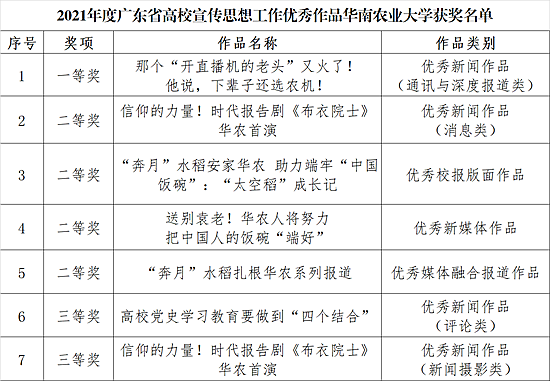 近日,广东省教育厅公布2021年度广东省高校宣传思想工作优秀作品评选结果,我校报送的作品获一等奖1项,二等奖4项,三等奖2项,共计获奖7项,获奖总数与暨南大学并列全省第一。这也是我校在此项评选中获得的历年最好成绩。