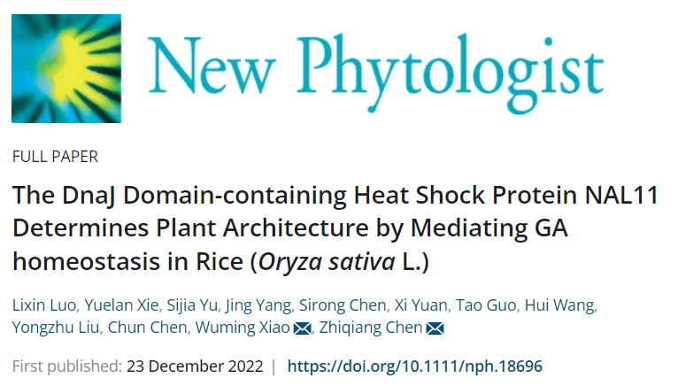 近日,华南农业大学国家植物航天育种工程技术研究中心陈志强教授团队在国际著名学术期刊New Phytologist(影响因子10.323)在线发表了题为“The DnaJ Domain-containing Heat Shock Protein NAL11 Determines Plant Architecture by Mediating GA homeostasis in Rice (Oryza sativa L.)”的学术论文。解析了热激蛋白NAL11通过调控赤霉素(GA)稳态影响水稻株型建成的机制,并揭示了水稻株型调控中存在的微调与平衡机制。