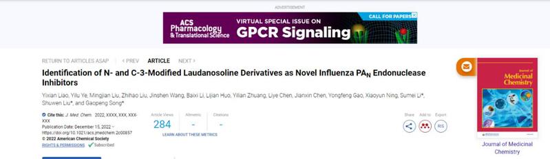 近日,我校材料与能源学院制药工程系宋高鹏副教授在在药物化学国际权威期刊Journal of Medicinal Chemistry(影响因子8.039,中科院1区Top期刊,药物化学领域的No.1)在线发表了题为“Identification of N- and C-3-Modified Laudanosoline Derivatives as Novel Influenza PAN Endonuclease Inhibitors”的研究论文(论文链接:https://doi.org/10.1021/acs.jmedchem.2c00857),发现了一类基于苄基四氢异喹啉为结构骨架的三位点结合型流感病毒PAN抑制剂。该研究是该团队继European Journal of Medicinal Chemistry(2022, 227, 113929; 2020, 189, 112048; 影响因子7.088,中科院1区Top期刊)之后的又一标志性研究成果。