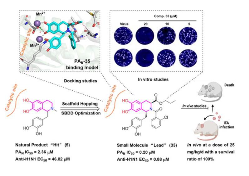 宋高鹏副教授联合南方医科大学刘叔文教授团队以天然PAN抑制剂D, L-氢溴酸劳丹素(LDS)为hit,通过对LDS与核酸内切酶(PAN)复合物结构生物学信息的分析,运用多位点结合策略,对LDS进行基于靶标结构和多样性导向的结构修饰,经过多轮的hit-to-lead等结构优化发现了一类基于1, 3-顺式-苄基四氢异喹啉为结构骨架的新型多位点结合型流感病毒PAN抑制剂,其能够同时靶向PAN的催化中心-口袋3和口袋4。本研究通过抑酶活性、细胞水平及动物(小鼠)水平的抗病毒活性评价,发现了多个具有高活性、低毒性、抗耐药的先导化合物。在初步成药性评价中,发现先导化合物35具有较高的代谢稳定性和较低的体内外毒性,是具有广阔开发前景的抗流感病毒候选药物。该研究为开发新型的多位点结合型流感病毒PAN抑制剂奠定了重要基础。