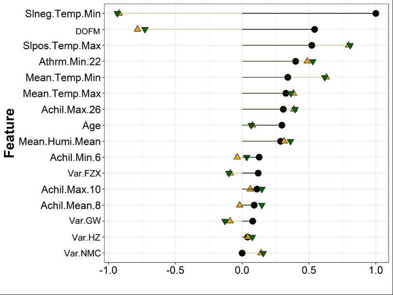 应用1天时间尺度数据所建随机森林算法评估的特征重要性(黑色圆圈)、特征与因变量的Pearson(橙色三角形)相关性和Spearman(深绿色三角形)相关性。横坐标数值表示重要性/相关性的程度,1为最重要/相关,0为不重要/不相关;正负值表示正相关或负相关。
