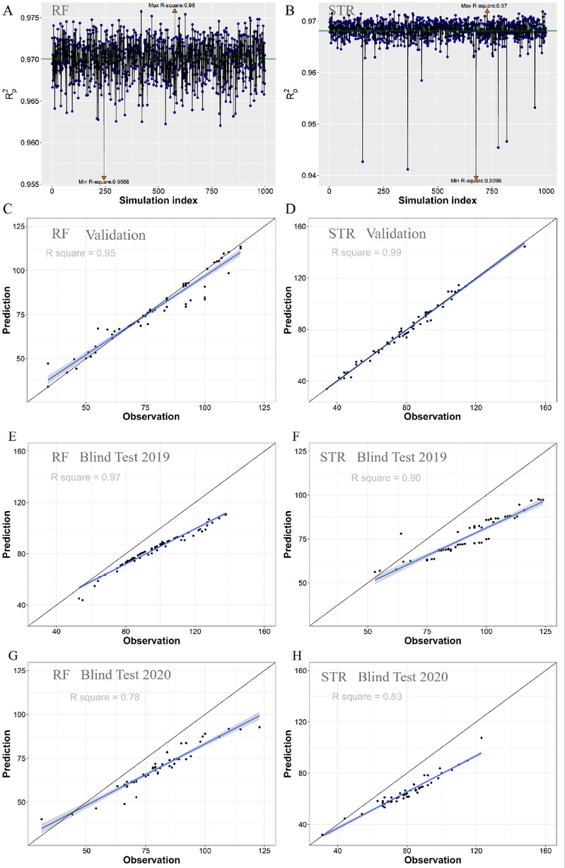 应用5天时间尺度数据集预测模型的鲁棒性和预测准确性评估。A和B,5-fold 999交重复交叉验证时两个预测模型的Rp2值。C和D,利用验证数据集估计模型的预测能力。E-H,利用盲测试数据集估计模型的预测能力。RF,随机森林模型,STR,逐步回归模型。