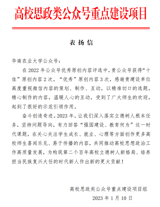 近日,学校官方微信公众号“华南农业大学”收到来自高校思政类公众号重点建设项目组的表扬信。2022年,我校官微获全国高校思政类重点建设公众号“十佳”原创内容2次,“优秀”原创内容3次。信中,项目组感谢我校“高度重视微信公众号内容的策划、制作、互动,以精准切口的选题,精心制作的内容,温暖人心的互动,受到了广大师生的欢迎,起到了很好的示范引领作用”。