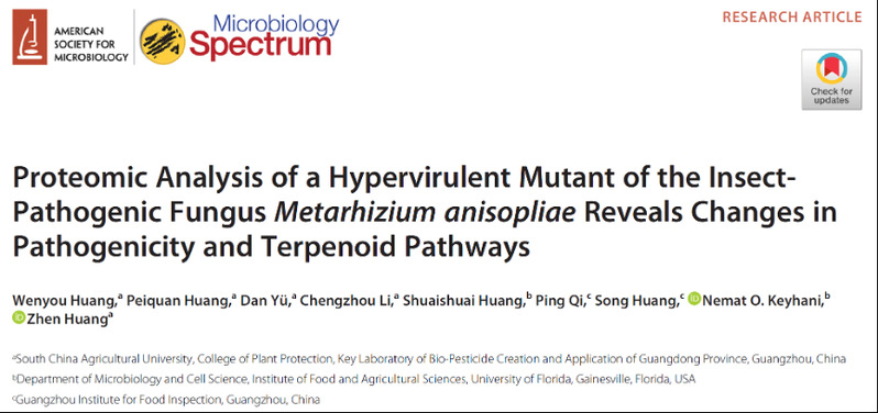 2022年12月,我校植物保护学院昆虫学系黄振副教授在生物学期刊Microbiology Spectrum(IF=9.04,中科院1区Top期刊)发表了题为“Proteomic analysis of a hypervirulent mutant of the insect pathogenic fungus Metarhizium anisopliae reveals changes in pathogenicity and terpenoid pathways”的研究论文(论文链接:https://doi.org/10.1128/spectrum.00760-22),提供了绿僵菌萜类生物合成代谢途径中FPPS1/GGPPS5基因突变或敲除后,突变菌株的抗紫外线和耐高温性能增强、次级代谢产物毒素发生改变、菌株毒力提高、杀虫时间大幅缩短的证据。本研究是该研究团队继筛选出抗紫外线、耐高温菌株(Appl Microbiol Biotechnol, 2016, 100: 9217-9228)及解析诱变机制(Environ Microbiol,2022, 24, 1362-1379)之后的标志性研究成果。