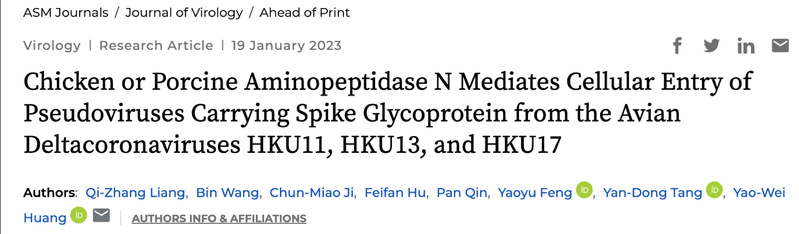 2023年1月,我校兽医学院黄耀伟教授课题组以华南农业大学兽医学院/岭南现代农业广东省实验室为第一单位,在国际病毒学权威杂志Journal of Virology在线发表题为“Chicken or porcine aminopeptidase N mediates cellular entry of pseudoviruses carrying spike glycoprotein from the avian deltacoronaviruses HKU11, HKU13, and HKU17”的文章(链接:https://journals.asm.org/doi/10.1128/jvi.01947-22),首次报道表达三种代表性野禽丁型冠状病毒(Deltacoronavirus, DCoV)——HKU11, HKU13或HKU17 的刺突蛋白(Spike)的假病毒可分别通过鸡或猪氨基肽酶N(APN)介导入侵相应种属的细胞,揭示自然界种类繁多的野禽DCoVs具备潜在的野禽到家禽、以及鸟类到哺乳类的跨物种传播能力。