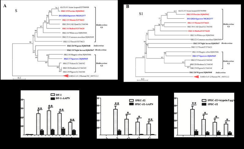 进一步的免疫共沉淀实验显示,HKU11、HKU13、HKU17的S1与鸡APN(chAPN)或猪pAPN(pAPN)可以相互作用;流式细胞分析显示,以上的S1纯化蛋白可以在细胞表面结合稳定表达chAPN 或pAPN的PDCoV非易感细胞,以及结合内源表达chAPN 或pAPN的鸡细胞或猪细胞。制备携带这些DCoV S蛋白(包括来自ISU42824的S)的假型慢病毒可以分别感染稳定表达chAPN 或pAPN的非易感细胞与内源表达chAPN 或pAPN的鸡细胞或猪细胞。而敲除chAPN 或pAPN后,这些假病毒对相应的敲除鸡细胞系或猪细胞系的入侵水平显著下降或几乎消失(图C,和图D)。最后,与此前报道的PDCoV感染细胞结果类似(Emerging Microbes & Infections, 2020, 9:457-468),加入胰酶可以显著促进这些假病毒入侵猪肠道上皮细胞(图E)。以上结果表明,夜莺 HKU11、文鸟HKU13、以及两种麻雀DCoV(来自美国的ISU42824与来自中国香港的HKU17),均有可能利用chAPN 或pAPN作为受体入侵细胞,尽管HKU17的S蛋白在进化上与PDCoV及ISU42824有较大差异。