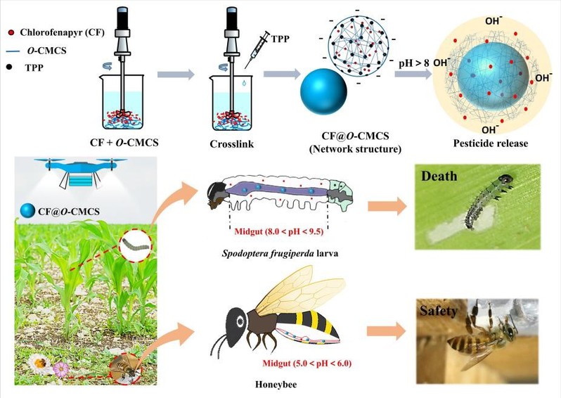 根据鳞翅目害虫(8.0<pH<9.5)与蜜蜂(5.0<pH<6.0)的肠道pH差异,通过多糖材料O-羧甲基壳聚糖 (O-CMCS)与三聚磷酸钠(TPP)交联反应,制备了pH响应控释虫螨腈纳米颗粒(CF@O-CMCS)。CF@O-CMCS纳米颗粒在酸性环境中表面收缩,降低了虫螨腈释放量,在碱性环境中则膨胀破裂,使虫螨腈大量释放。与虫螨腈悬浮剂相比,CF@O-CMCS对草地贪夜蛾3龄幼虫具有更好的防效,显著降低了对蜜蜂毒性。通过LC-MS/MS对肠道中的虫螨腈及其代谢物(溴代吡咯腈)检测,摄入CF@O-CMCS组蜜蜂肠道的农药含量显著低于摄入虫螨腈悬浮剂组,而在草地贪夜蛾的肠道中CF@O-CMCS组的农药含量比虫螨腈悬浮剂组高。研究揭示了O-羧甲基壳聚糖基纳米农药在鳞翅目害虫和蜜蜂之间的药物递释机制,为降低农药对蜜蜂毒性,提高农药有效利用率提供了解决新方案。相关研究发表在International Journal of Biological Macromolecules(IF2022=8.03)上(论文链接:https://doi.org/10.1016/j.ijbiomac.2022.10.182)。