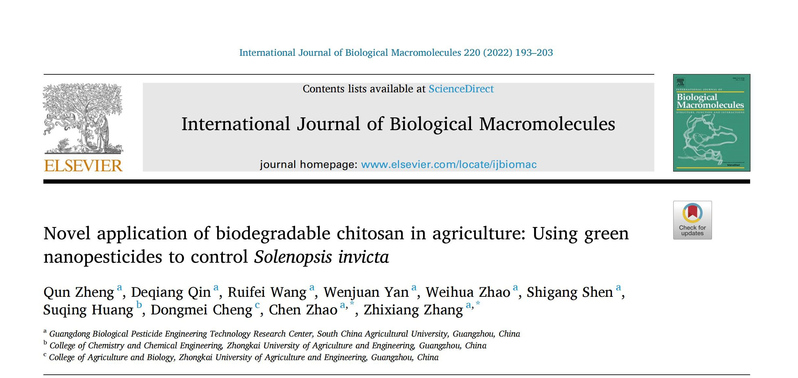针对红火蚁中肠为酸性的特性,利用可生物降解的壳聚糖(CS)和羧甲基壳聚糖(CMCS)制备了对pH敏感的壳聚糖基鱼藤酮(Rot)纳米颗粒(CS/CMCS/Rot-NPs)。壳聚糖基纳米粒子对Rot显示出光保护和缓慢的持续释放作用,显著提高了Rot对红火蚁的杀虫活性。与鱼藤酮原药相比,这项研究制备的CS/CMCS/Rot-NPs显著削弱了红火蚁的攻击性,降低了红火蚁及其生存环境中的毒液生物碱含量。研究揭示了可生物降解壳聚糖材料在农业中的新应用,通过生产壳聚糖基纳米农药控制红火蚁,增加其在生态环境中的生存成本,削弱其生存能力从而限制其种群增长。研究表明,纳米技术与植物性杀虫剂相结合,可作为一种新颖、安全、有效和生态友好的方法来控制红火蚁。相关研究发表在International Journal of Biological Macromolecules (IF=8.03)上 (论文链接:https://doi.org/10.1016/j.ijbiomac.2022.08.066)。