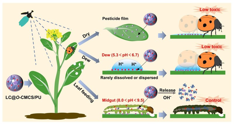 基于农田系统中露水多为酸性,而鳞翅目害虫肠道为碱性,以O-羧甲基壳聚糖 (O-CMCS) 包封高效氯氟氰菊酯 (LC)形成LC/O-CMCS,再通过植物油基聚氨酯 (PU) 包覆,制备了碱性响应型LC@O-CMCS/PU纳米制剂。与LC商品制剂相比,LC@O-CMCS/PU纳米制剂在叶表面具有更强的附着力和抗露水淋溶特性,对小菜蛾比LC乳油具有更好的防效,显著降低了对异色瓢虫的毒性。对于露水存在的叶片上,纳米制剂中的有效成分难以被溶出,显著改善了异色瓢虫在施药叶片上的生存环境。研究揭示了以多糖+聚氨酯为载体的纳米农药制剂在农田微环境中的特殊控释机制,为研究绿色环保农药与天敌联合防控害虫提供了新思路。相关研究发表在Carbohydrate Polymers(IF=10.72)上(论文链接:https://doi.org/10.1016/j.carbpol.2022.120373)。
