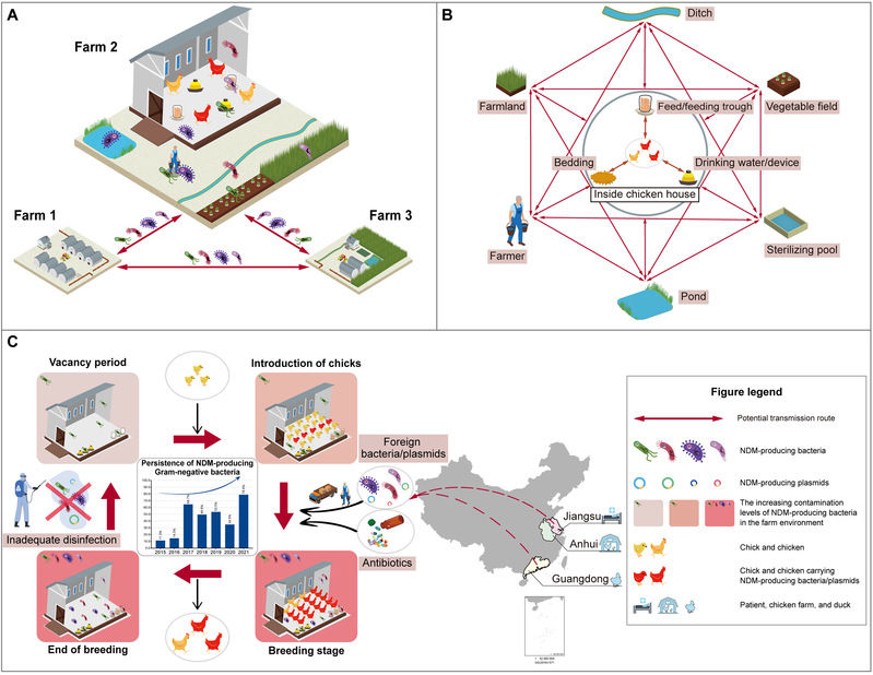 该研究发现,CRE在鸡场、鸡场内外环境(包括鸡场周边农田、菜地)长期持留且检出率居高不下,空栏期的鸡舍环境仍存在CRE的污染,鸡场流行的克隆株和blaNDM质粒有年度变化,养殖场间、养殖场舍内外环境以及养殖场与外界(包括病人)均存在CRE的克隆传播和blaNDM质粒的水平传播。本研究结果提示到,空栏期鸡场环境存留的CRE,人员、器具等的流动和交叉污染使鸡场不断从外界获得新的CRE菌株和blaNDM质粒,抗生素的大量使用、较差的卫生条件以及较低的管理水平等共同导致CRE在鸡场的传播和长期持留,增加了CRE传播给人类的风险。这表明亟需加强养殖场的生物安全防控,以防止多重耐药细菌在养殖场定植以及在人类和养殖场之间的“双向”传播。