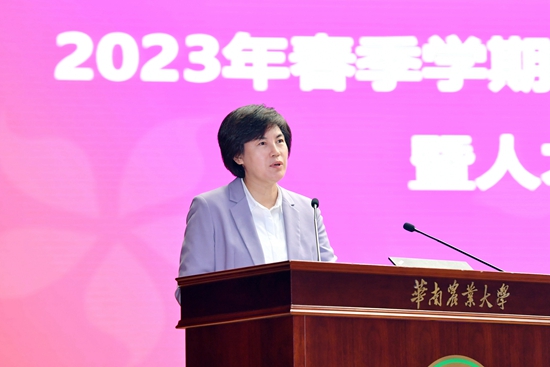 “华农将把服务广东高质量发展尤其是乡村振兴摆在‘双一流’建设的突出位置,围绕深入实施‘百县千镇万村高质量发展工程’和‘绿美广东生态建设’,整合全校资源,创新体制机制,在服务经济社会发展的生动实践中培养造就人才、促进科技创新、强化引领支撑作用,为学校‘双一流’建设注入强大动力。”刘雅红指出,2023年,学校工作的总体思路是:以习近平新时代中国特色社会主义思想为指导,以深入学习贯彻党的二十大精神为主线,突出高质量内涵式发展主题,认真贯彻落实中央农村工作会议、广东省高质量发展大会和全国、全省教育工作会议精神,齐心协力加油干,振奋精神创一流,以全面提高人才自主培养质量为重点,努力建设世界一流农业大学,在扎实推进广东高质量发展、实施“百县千镇万村高质量发展工程”和“绿美广东生态建设”中担当作为,为广东在全面建设社会主义现代化国家新征程中走在全国前列、创造新的辉煌作出新贡献。