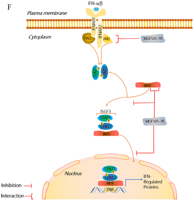 终上,ASFV MGF505-7R通过与IRF9相互作用抑制IFN-I信号转导,ASFV△MGF505-7R重组毒株在体外减轻了ASFV对IFN-I信号的抑制作用,增加了对IFN-I的敏感性。该研究揭示了ASFV拮抗IFN-I信号转导的一种新机制(图F),为开发ASFV基因缺失疫苗和抗ASFV药物靶点提供了新思路。