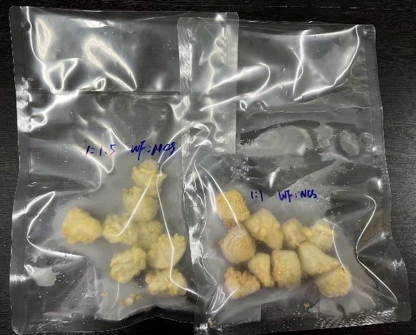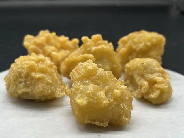 预裹粉的组成成分及比例极大地影响着油炸挂糊类产品的品质,基于此,课题组目前在探究新型天然辅料添加对裹粉面糊及基料品质的改善,并通过在裹粉中添加功能性营养成分,丰富裹粉的营养价值,改善裹粉的吸油率、脆性等。添加新型辅料所得到的预油炸杏鲍菇产品具有高水分含量和较低的含油量,多汁酥脆,味道鲜美且具有杏鲍菇爽滑脆嫩的口感,并且经冷冻储藏后复热仍能保持高水分含量和低油的特性,极大改善了传统裹粉和裹糊出现的吸油量大、裹粉易脱落等问题。所得到的预油炸产品经速冻和冻藏后,能够较好保持初炸产品的色、香、味、形,解冻后没有相互粘结现象。